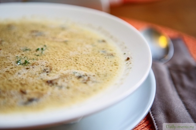 куриный бульон, шампиньоны, сливки, 35,0% жирности, бекон, лук репчатый, сыр пармезан, топленое масло гхи, соль поваренная пищевая, перец черный молотый