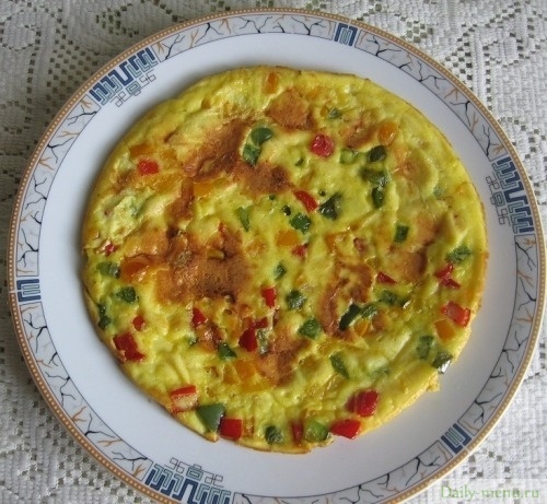 яйцо куриное, перец болгарский красный, помидоры, сыр полутвердый (голландский), лук репчатый, масло подсолнечное, укроп и другие пряные травы, соль поваренная пищевая