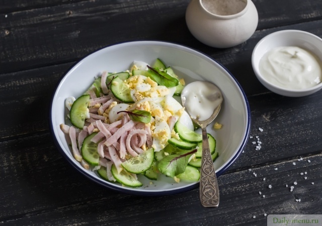 огурец грунтовый, яйцо куриное, сметана 30% жирности, индейка копчёная, вода, соль поваренная пищевая
