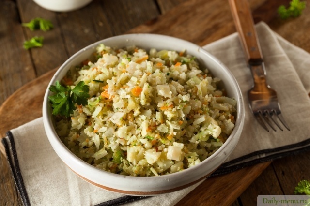 капуста цветная, лук зеленый, лепестки миндальные, морковь, масло оливковое, петрушка, соль поваренная пищевая