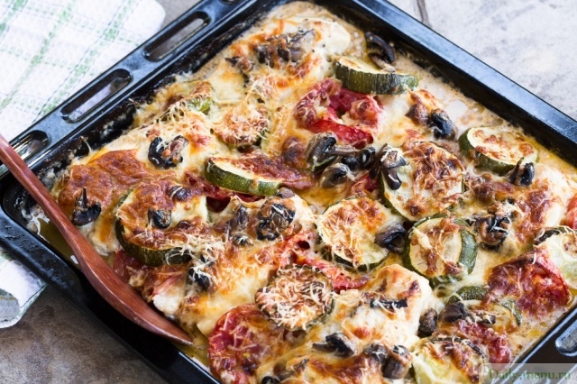 цуккини, курица филе, без кожи, сметана 25% жирности, шампиньоны, помидоры, сыр моцарелла, лук репчатый, масло оливковое, соль поваренная пищевая, перец черный молотый