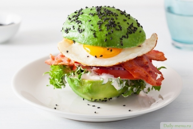 авокадо, яйцо куриное, бекон, помидоры, майонез , салат романо, кунжут-семя