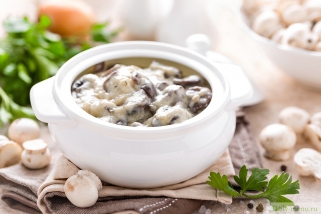 шампиньоны, сметана 20,0% жирности, сыр голландский, масло топленое, чеснок, соль поваренная пищевая, перец черный молотый