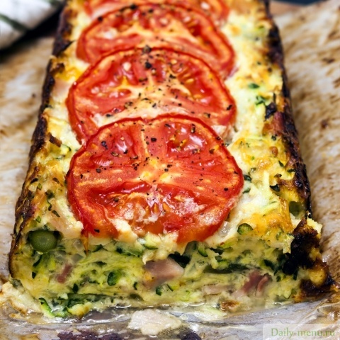 кабачок, творог 18%, сыр голландский, яйцо куриное, помидоры, ветчина в форме, масло сливочное 72%, чеснок