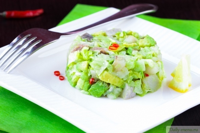 авокадо, огурец грунтовый, сардины океанические консервы, салат, масло оливковое, сок лимонный, соль поваренная пищевая
