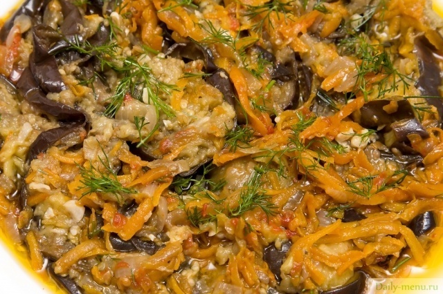баклажаны, сок томатный, морковь, лук репчатый, укроп и другие пряные травы, масло подсолнечное