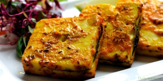 сыр сулугуни, топленое масло гхи, прованские травы, зира (кумин), карри