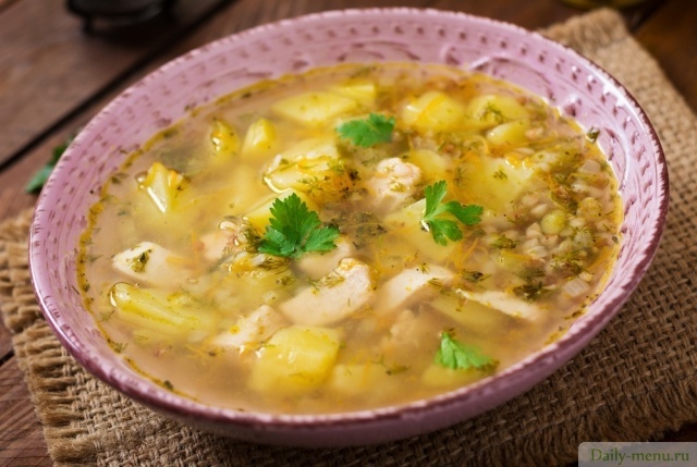 вода, куриная грудка с кожей, гречневая крупа ядрица, морковь, лук репчатый, соль поваренная пищевая, масло топленое