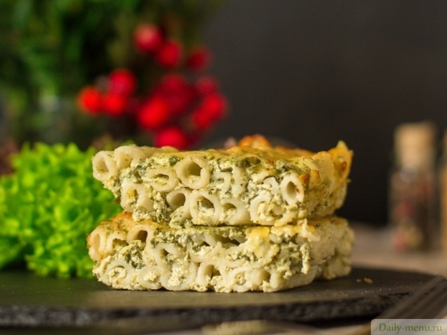 макароны отварные, брынза , яйцо куриное, сливки, 10,0% жирности, сыр российский, петрушка, чеснок, масло сливочное 72%, соль поваренная пищевая