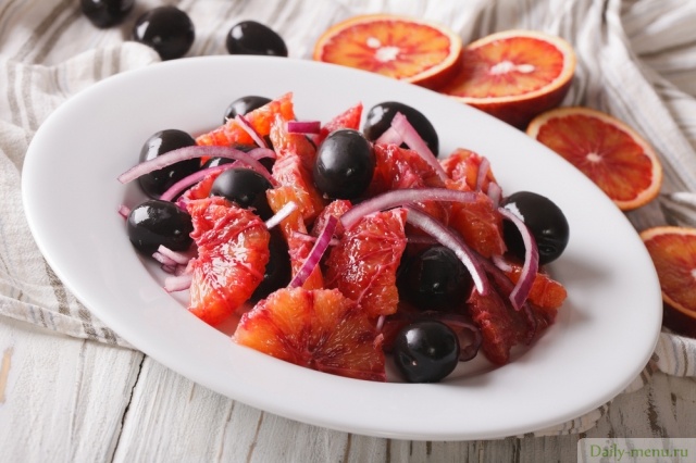 апельсин, маслины средние и мелкие, масло оливковое, лук репчатый, винный уксус 3%, перец черный молотый