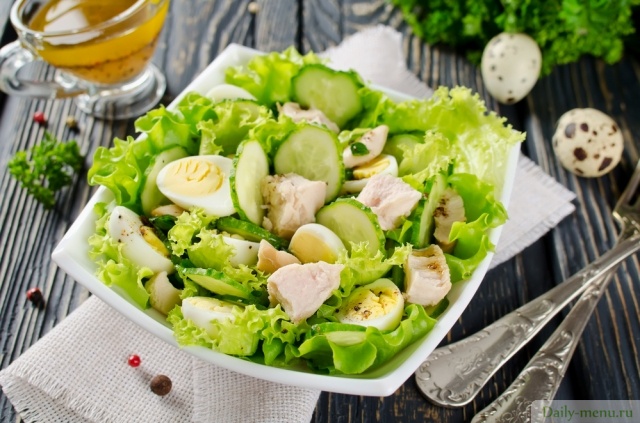 огурец грунтовый, печень трески, яйцо перепелиное, салат, масло оливковое, лук зеленый, сок лимонный, горчица столовая, соль поваренная пищевая, перец черный молотый