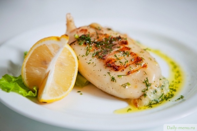 кальмар, шампиньоны, лук репчатый, молоко 1,5%, сыр полутвердый (голландский), укроп и другие пряные травы, масло оливковое, чеснок, соль поваренная пищевая