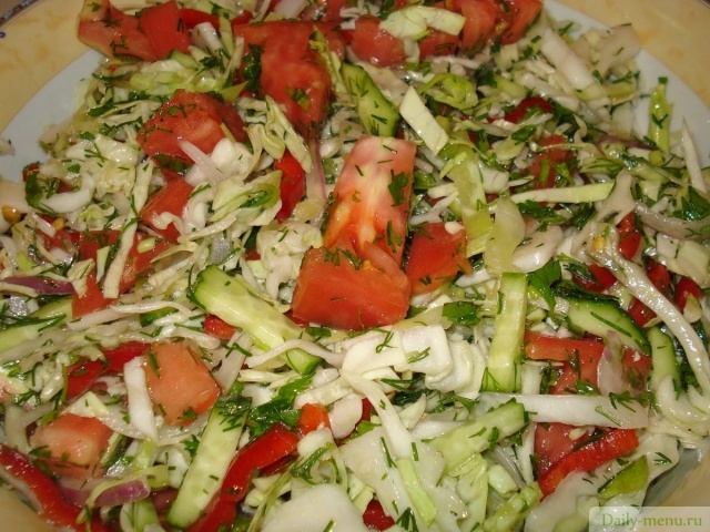 огурец грунтовый, помидоры, капуста белокочанная, масло оливковое, уксус 3%, соль поваренная пищевая