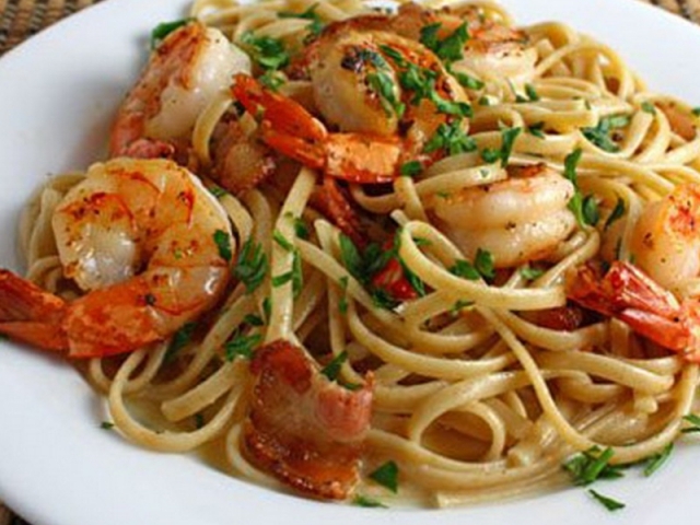 макароны из муки в/с, вода, лук репчатый, кальмар, креветки очищенные, сливки, 10,0% жирности, сыр твердый (маасдам), масло оливковое