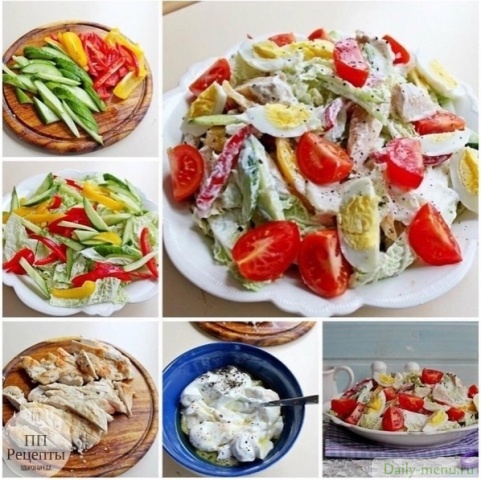 курица филе, без кожи, помидоры, перец болгарский красный, йогурт 1,5% , огурец грунтовый, капуста пекинская, яйцо куриное, масло оливковое, соль поваренная пищевая, перец черный молотый