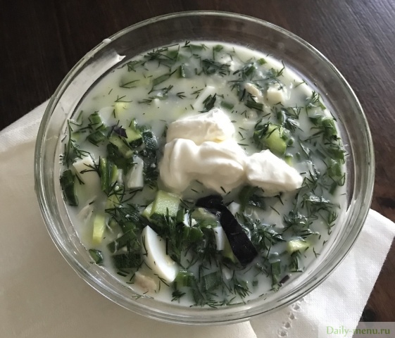 вода минеральная, айран (тан) негазированный нежирный, курица филе, без кожи, яйцо куриное, огурец грунтовый, укроп и другие пряные травы, лук зеленый, соль поваренная пищевая, перец черный молотый