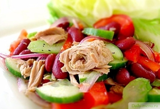 фасоль красная, консервированная, помидоры, огурец грунтовый, тунец натуральный консервы, перец болгарский красный, лук репчатый, салат айсберг, сок лимонный, соль поваренная пищевая, перец черный молотый