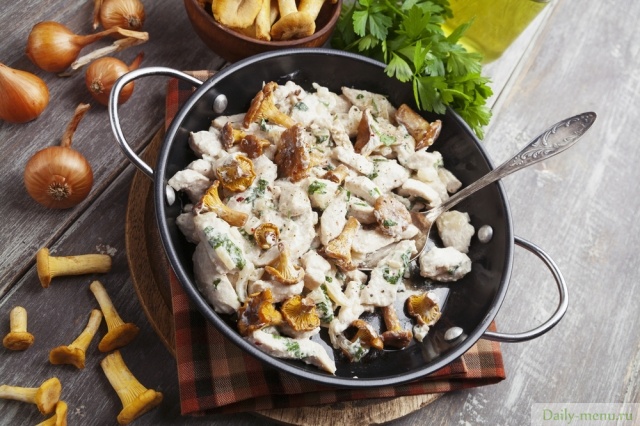 лисички, курица филе, без кожи, сметана 20,0% жирности, лук репчатый, масло топленое, петрушка, соль поваренная пищевая, перец черный молотый