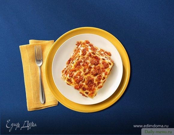 сливки, 20,0% жирности, протертые помидоры trattoria di maestro t, фарш из говядины, листы лазаньи, сыр твердый (маасдам), лук репчатый, масло сливочное 82%, мука пшеничная , соль поваренная пищевая, перец черный молотый