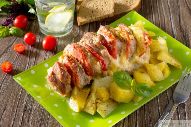 свинина вырезка, помидоры, сыр голландский, соль поваренная пищевая, перец черный молотый