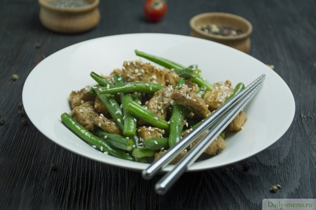 свинина вырезка, фасоль стручковая, лук репчатый, соевый соус, масло оливковое, кунжут-семя, соль поваренная пищевая, перец красный жгучий , перец черный молотый