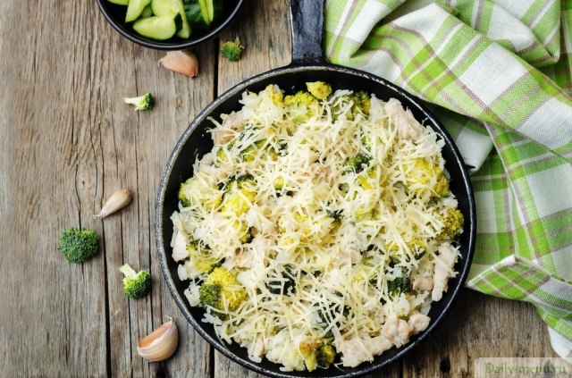 курица филе, без кожи, сливки, 20,0% жирности, вода, брокколи, рис белый, сыр пармезан, масло оливковое, соль поваренная пищевая, перец черный молотый
