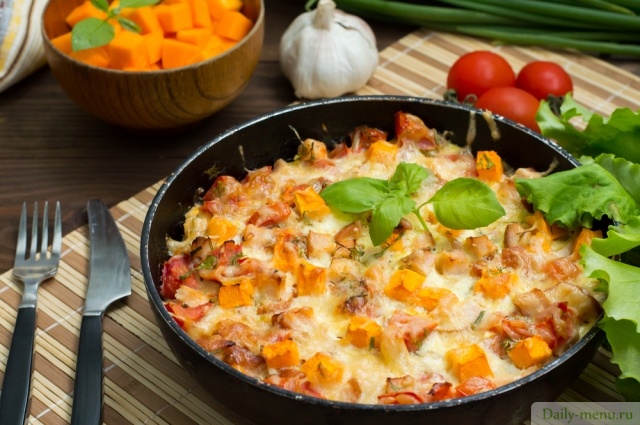 тыква, курица филе, без кожи, яйцо куриное, помидоры черри, молоко 2,5% , лук репчатый, масло оливковое, соль поваренная пищевая, перец черный молотый, травы итальянские, смесь