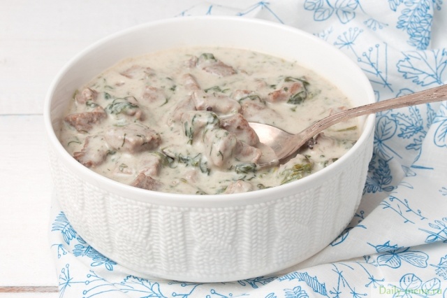 телятина спинная часть, сливки, 20,0% жирности, лук репчатый, укроп и другие пряные травы, чеснок, соль поваренная пищевая, смесь перцев