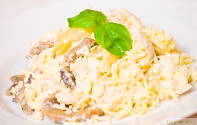 шампиньоны, кальмар (мясо), сыр плавленый, сыр адыгейский, лук репчатый, орех грецкий, сметана 20,0% жирности, майонез , масло топленое, чеснок, соль поваренная пищевая