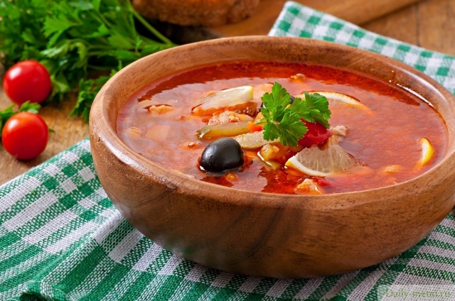 вода, огурец соленый, грудинка копчено-запеченная (свинина), рассол огуречный, маслины средние и мелкие, колбаса вареная молочная, лук репчатый, томатная паста, лимон, масло оливковое, соль поваренная пищевая, лавровый лист, перец черный молотый