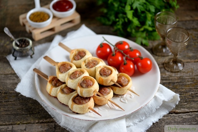 слоеное тесто бездрожжевое, фарш из говядины, фарш из свинины, лук репчатый, соевый соус, чеснок, смесь перцев