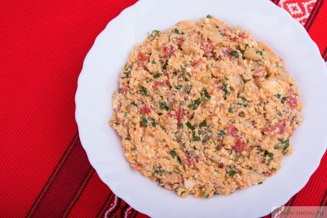 помидоры, брынза , яйцо куриное, перец болгарский красный, лук репчатый, масло оливковое, петрушка, соль поваренная пищевая, перец черный молотый