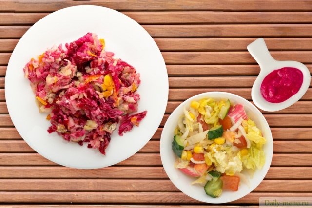 картофель вареный, куриная грудка, без кожи, огурец соленый, майонез , свекла, яйцо куриное, морковь, лук репчатый, яблочный уксус, сахар-песок, соль поваренная пищевая