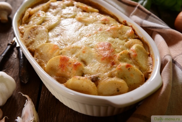 картофель, шампиньоны, бекон, сливки, 10,0% жирности, сыр голландский, сметана 18% жирности, масло топленое, чеснок, соль поваренная пищевая, перец черный молотый