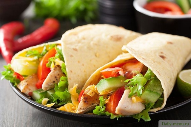 курица филе, без кожи, перец болгарский красный, помидоры, огурец грунтовый, тортилья, сметана 20,0% жирности, горчица столовая