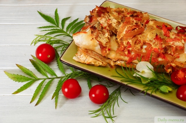 минтай, сметана 18% жирности, перец болгарский красный, помидоры, яйцо куриное, лук репчатый, масло оливковое, сок лимонный, соль поваренная пищевая, травы итальянские, смесь