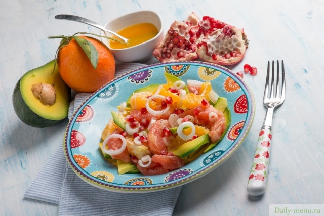 грейпфрут, апельсин, авокадо, гранат, лук-шалот, масло оливковое, перец черный молотый, соль поваренная пищевая, яблочный уксус