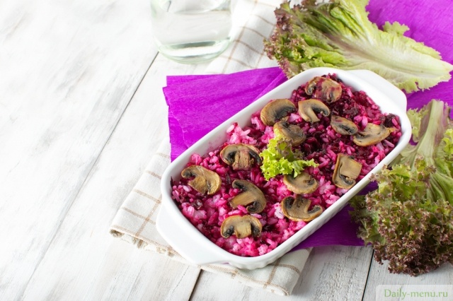 овощной бульон, шампиньоны, рис белый, свекла, лук репчатый, масло оливковое, соль поваренная пищевая, перец черный молотый
