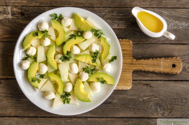 дыня, сыр моцарелла, авокадо, масло оливковое, сок лимонный, мед натуральный (мёд), петрушка, соль поваренная пищевая