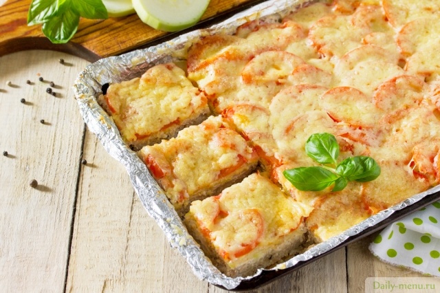 кабачок, фарш говядина/свинина 50/50, помидоры, яйцо куриное, лук репчатый, сыр моцарелла, сметана 18% жирности, молоко 2,5% , масло оливковое, чеснок, соль поваренная пищевая, перец черный молотый