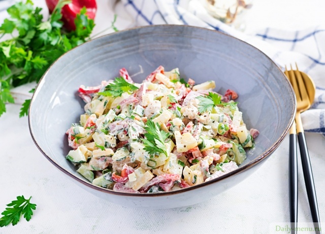 перец красный сладкий, ветчина в форме, огурец грунтовый, сыр голландский, йогурт 3,2% , лук репчатый, петрушка, яблочный уксус, соль поваренная пищевая