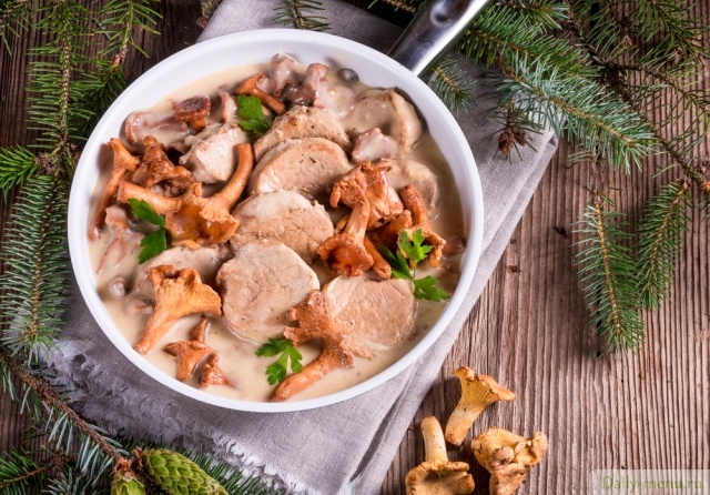 свинина шейная часть мякоть, лисички, вода, лук репчатый, масло оливковое, чеснок, петрушка, соль поваренная пищевая, перец черный молотый