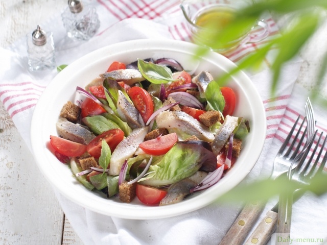 сельдь слабосоленая, помидоры, хлеб ржано-пшеничный, лук репчатый, масло оливковое, салат, соль поваренная пищевая, перец черный молотый