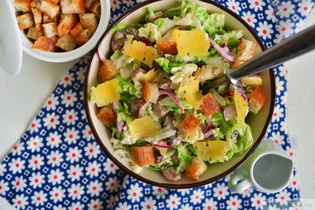 шампиньоны, капуста пекинская, сыр голландский, хлеб пшеничный, лук репчатый, майонез , масло оливковое, яблочный уксус, соль поваренная пищевая, перец черный молотый