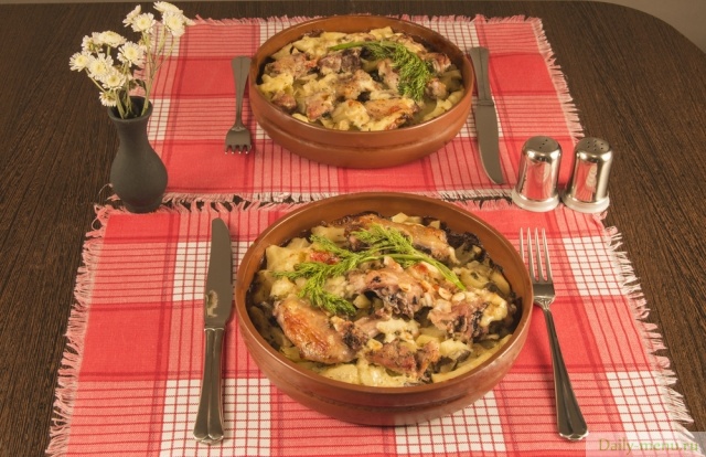 Крылышки с картошкой, запечённые в глиняной тарелке