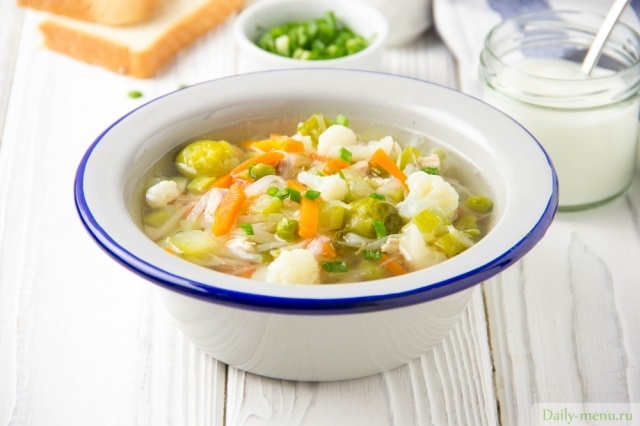 вода, кабачок, капуста белокочанная, капуста цветная, капуста брюссельская, горошек замороженный, морковь, лук репчатый, масло оливковое, соль поваренная пищевая