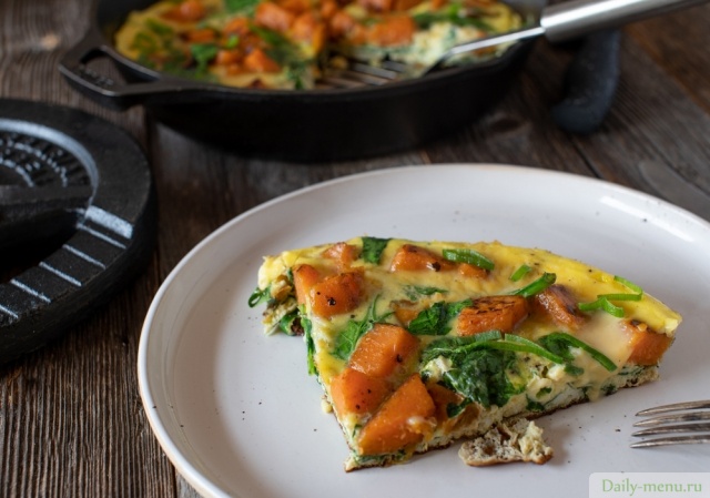 яйцо куриное, батат, молоко 2,5% , шпинат, сыр гауда, масло топленое, чеснок, соль поваренная пищевая