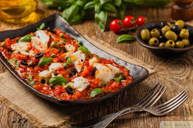 треска, помидоры. консервы, маслины средние и мелкие, оливки. консервы, каперсы консервированные, лук репчатый, масло оливковое, базилик свежий, чеснок, соль поваренная пищевая, травы итальянские, смесь, смесь перцев