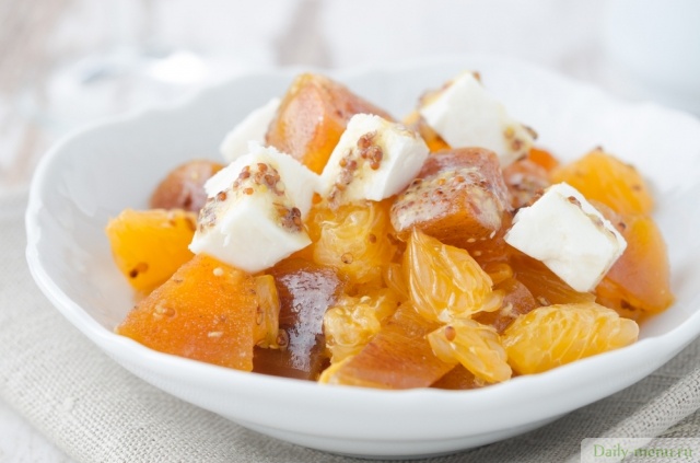 хурма, сыр фета, мандарин, салат, орех грецкий, масло оливковое, сок лимонный, горчица дижонская