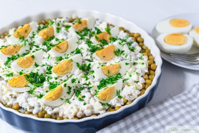 горошек зеленый. консервы, яйцо куриное, картофель вареный, сметана 20,0% жирности, сельдь слабосоленая, яблоки, лук репчатый, горчица столовая, петрушка, соль поваренная пищевая, смесь перцев